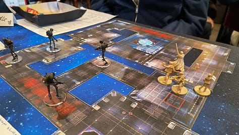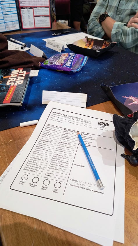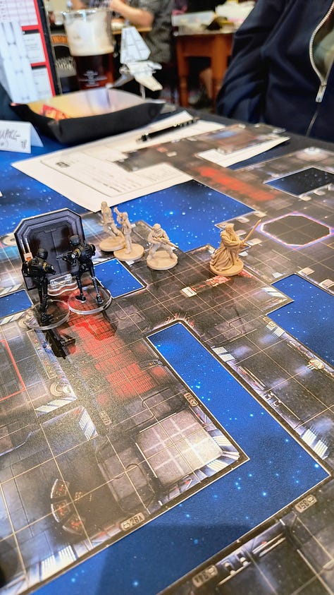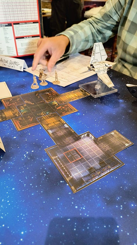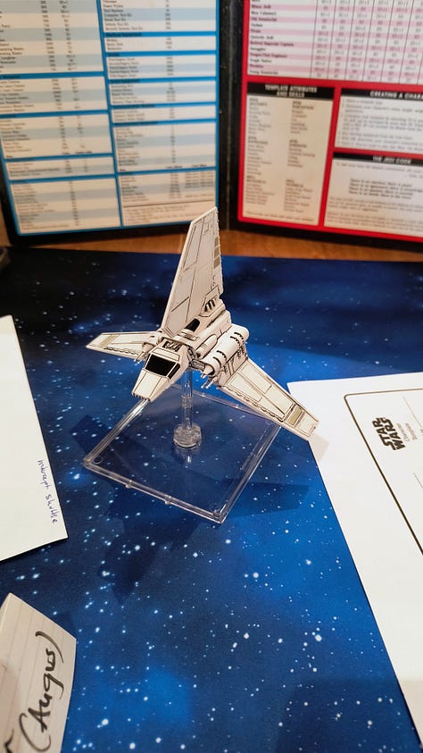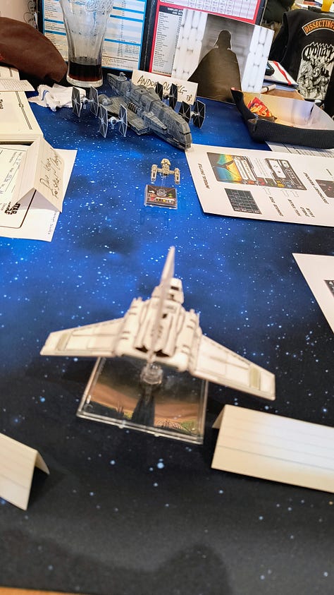The game I had originally signed up for on the Friday afternoon was cancelled, but @filmfan68.bsky.social stepped up and offered the WEG Star Wars D6 adventure Scavenger Hunt in its place. Like all good Star Wars adventures we were a ragtag gang of hopeless rebels sent on a mission to the Dankayo system to recover data banks after an Imperial assault, but those bastards were flying away with it and we were giving chase. The Star Wars setting was brought to life with fantastic miniatures and space ships from various games set against a star scape battle mat. And of course we were victorious.